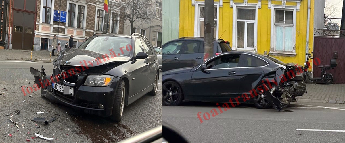 Două autoturisme, un BMW, înmatriculat în Hunedoara a lovit din lateral spate, cu viteză foarte mare, având în vedere daunele suferite, un alt autoturism Mercedes. Impactul a fost unul violent având în vedere daunele suferite de cele două mașini sunt foarte mari. Accident grav pe strada Dorobanților, din Cluj Napoca.