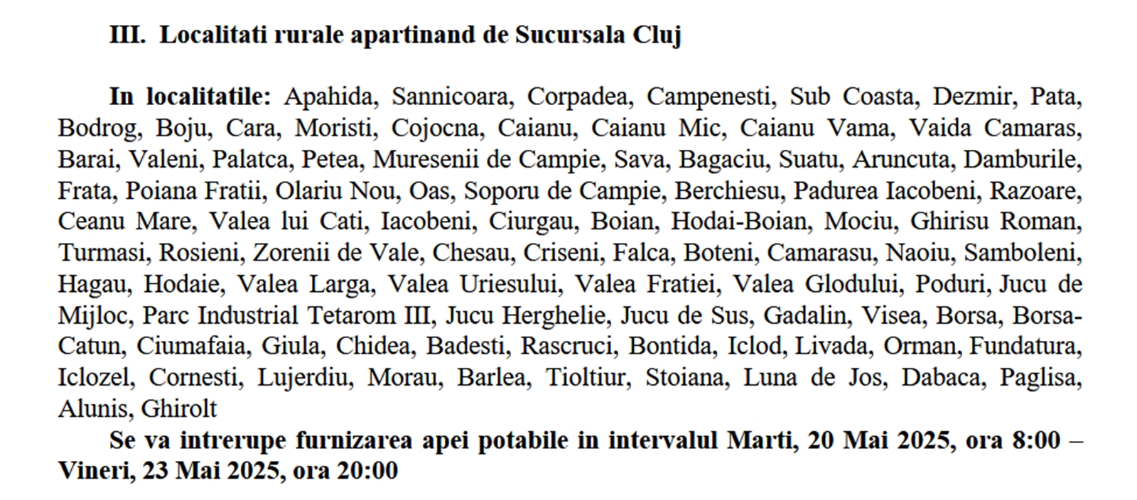 Compania de Apă Someș a transmis în cursul zilei de joi, un sms pentru toți abonații, în care se arată care sunt lucrprile afectate.
