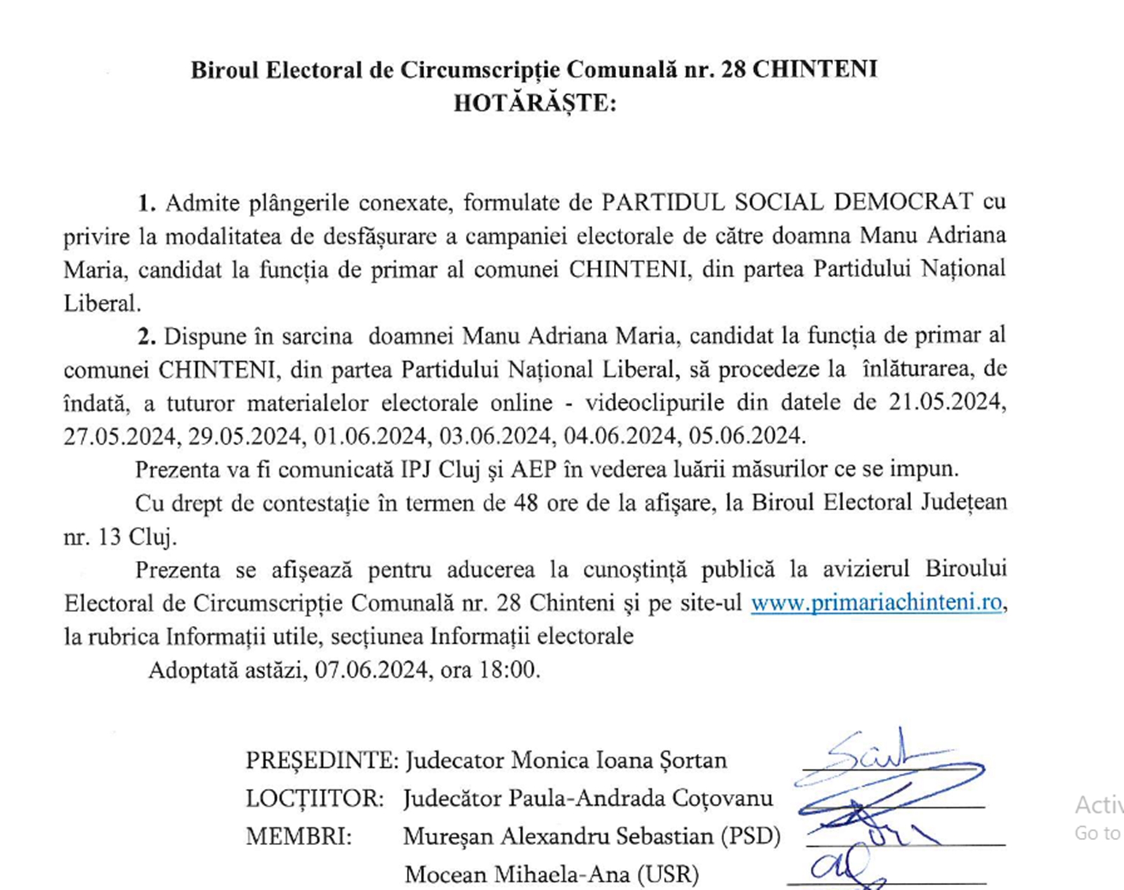 ”Dispune în sarcina doamnei Manu Adriana Maria, candidat la funcția de primar al comunei Chinteni, din partea PNL, să procedeze la înlăturarea, de îndată, a tuturor materialelor online – videoclipurile din datele de 21.05.2024, 27.05.2024, 29.05.2024. 01.06.2024, 04.06.2024 și 05.06.2024. Prezenta va fi comunicată IPJ Cluj și Autorității Electorale Permanente în vederea luării măsurilor care se impun”, se arată decizia Biroului Electoral Chinteni.