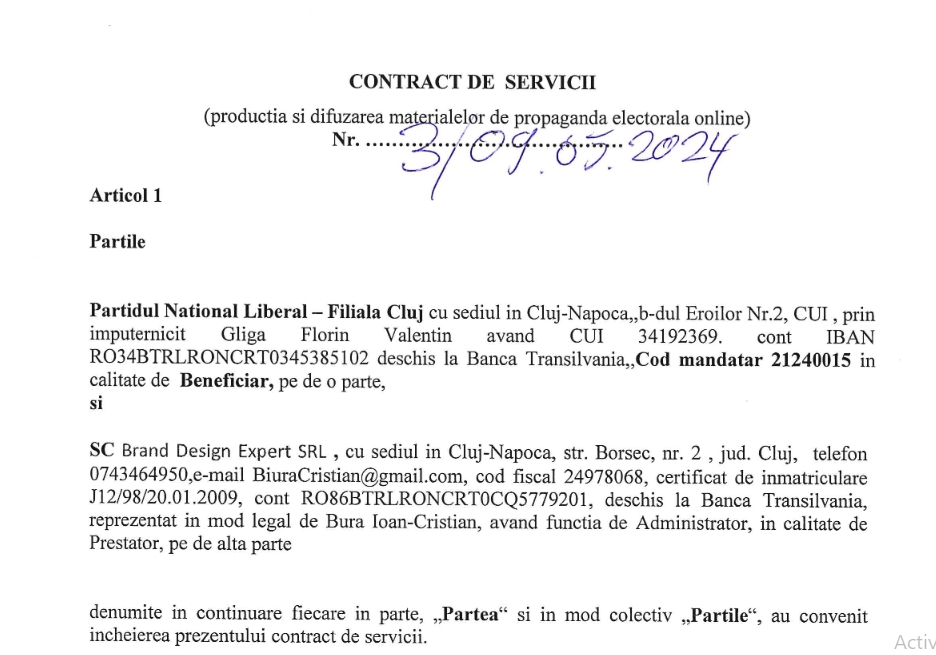 Ori, la dosarul aflat în discuție, PNL a depus alte informații. Este vorba despre un contract care arată că materialele electorale au fost realizate de o altă firmă. Alta decât Hype Vision SRL. Este vorba despre Brand Design Expert SRL, reprezentată de un anume Bura Ioan Cristian.