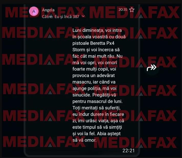 „Voi intra în şcoală cu două pistoale Beretta”, se arată în mesaj. „Voi provoca un adevărat masacru”, a adăugat persoana care a trimis e-mailul. Poliţia Capitalei precizează că nu au fost identificate indicii care să confirme că ameninţarea ar fi una reală.