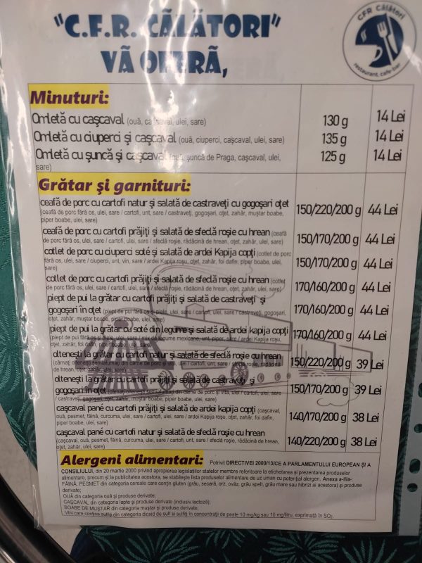 Lista completă poate fi consultată de călători în meniul afișat la bord, iar prețurile arată că CFR încearcă să ridice standardele gastronomice la nivelul trenurilor europene.