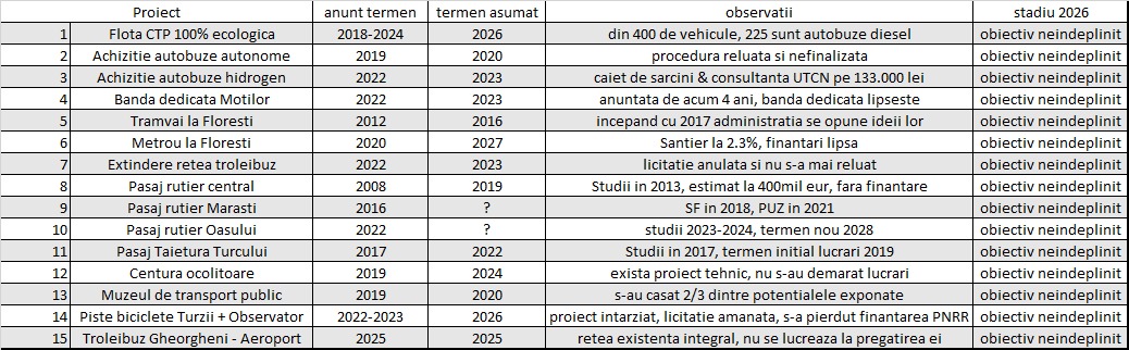 Bilanțul include 15 proiecte majore. Flota CTP 100% ecologică, promisă pentru perioada 2018–2024, este încă departe de obiectiv, cu sute de autobuze diesel în circulație. Achizițiile de autobuze autonome și pe hidrogen au fost reluate, amânate sau reduse la faze de consultanță.