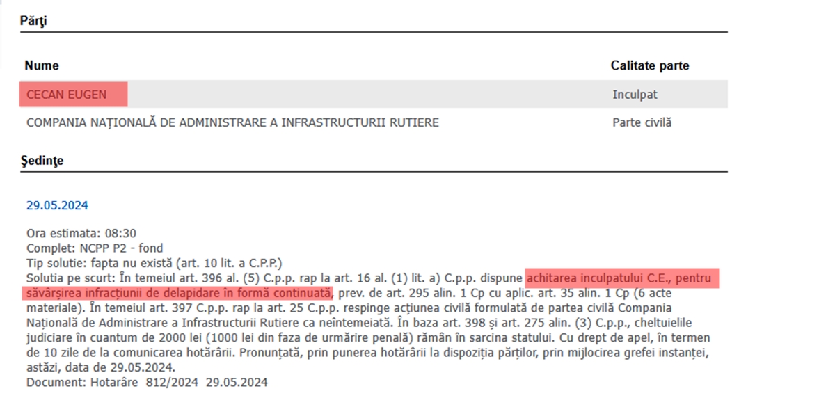 Totodată, judecătorul a respins acțiunea civilă formulată de Compania Națională de Administrare a Infrastructurii Rutiere, ca neîntemeiată, și a stabilit că cheltuielile judiciare rămân în sarcina statului.