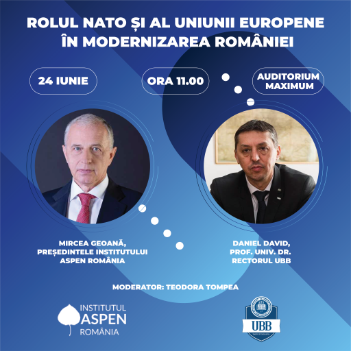 Universitatea Babeș-Bolyai din Cluj-Napoca, împreună cu Institutul Aspen România, va organiza, în data de 24 iunie 2022, de la ora 11.00, în Auditorium Maximum al UBB, dezbaterea cu tema „Rolul NATO și al Uniunii Europene în modernizarea României”, dintre rectorul UBB, prof. univ. dr. Daniel David, și secretarul adjunct NATO, Excelența Sa domnul Mircea Geoană.