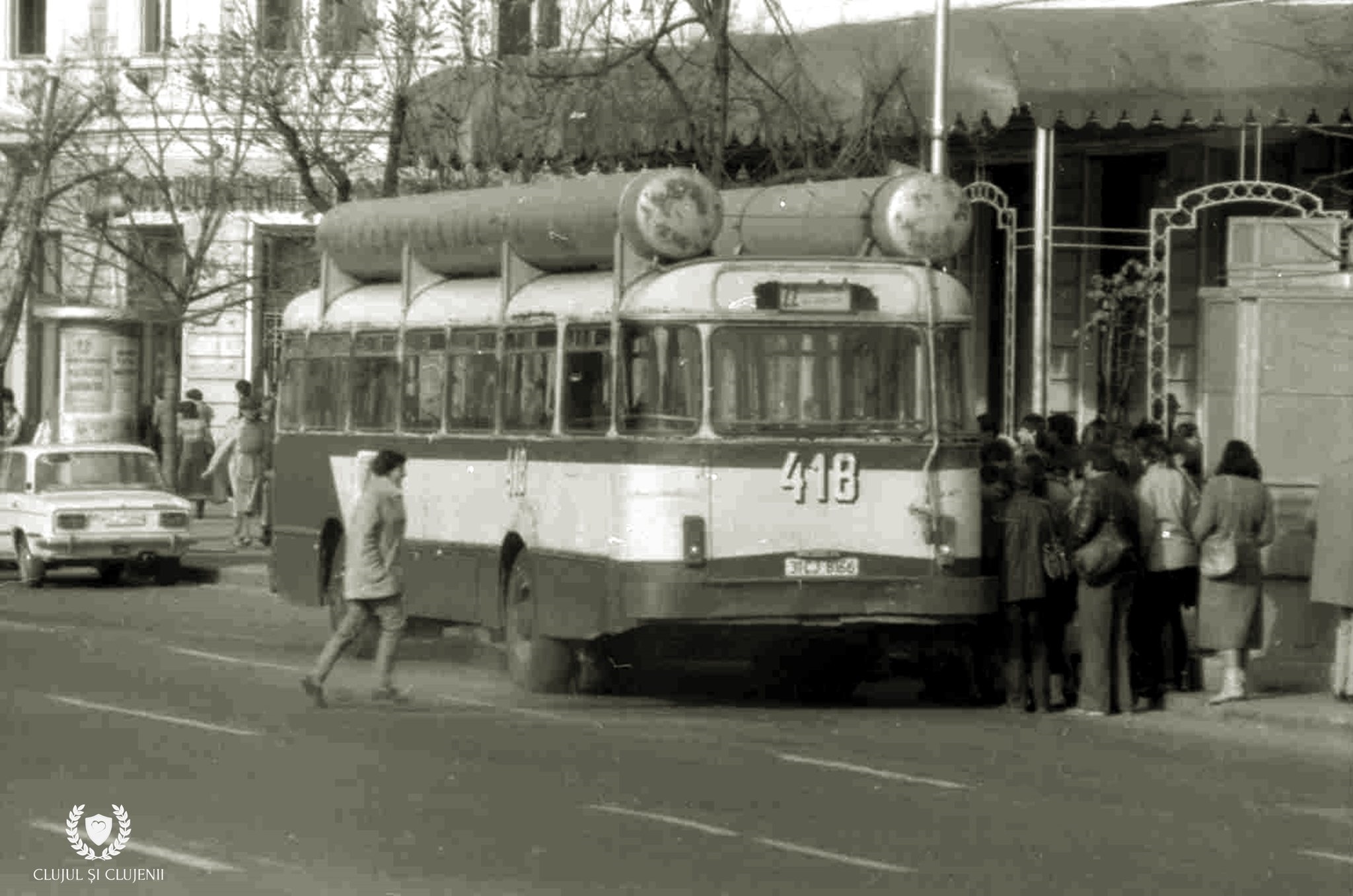”Zepelinurile comuniste. Cluj-Napoca – autobuz urban 1986. Combustibilul este asigurat de rezervoare de gaz montate pe acoperișul vehiculului. În fotografie Autobusul 22 (Gheorgheni – Centru) în ultima stație în Piața Unirii, în fața fostei Librării ,,George Coșbuc” – Dacia Felix de mai târziu și lângă restaurantul ,Someșul”, au scris cei care au prezetat fotografia de la Clujul și clujenii.