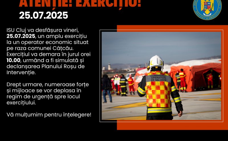 Inspectoratul pentru Situații de Urgență „Avram Iancu” al județului Cluj a anunțat organizarea unui amplu exercițiu cu forțe și mijloace în teren.