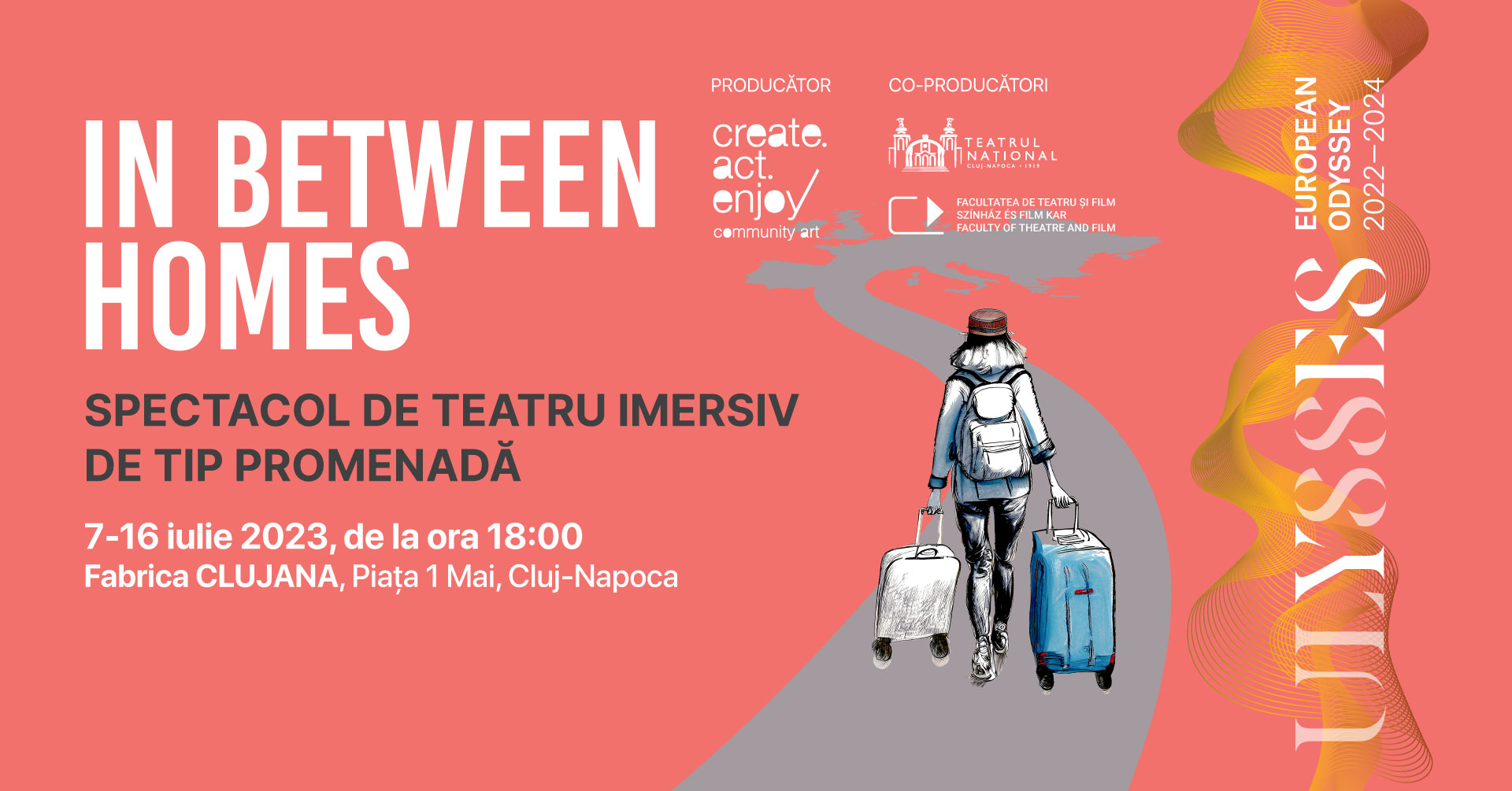 Este vorba de spectacolul imersiv de tip promenadă „IN BETWEEN HOMES”, produs în cadrul proiectului european Ulysses: European Odyssey (UEO), împreună cu Teatrul Național „Lucian Blaga” Cluj-Napoca și Facultatea de Teatru și Film Cluj-Napoca.