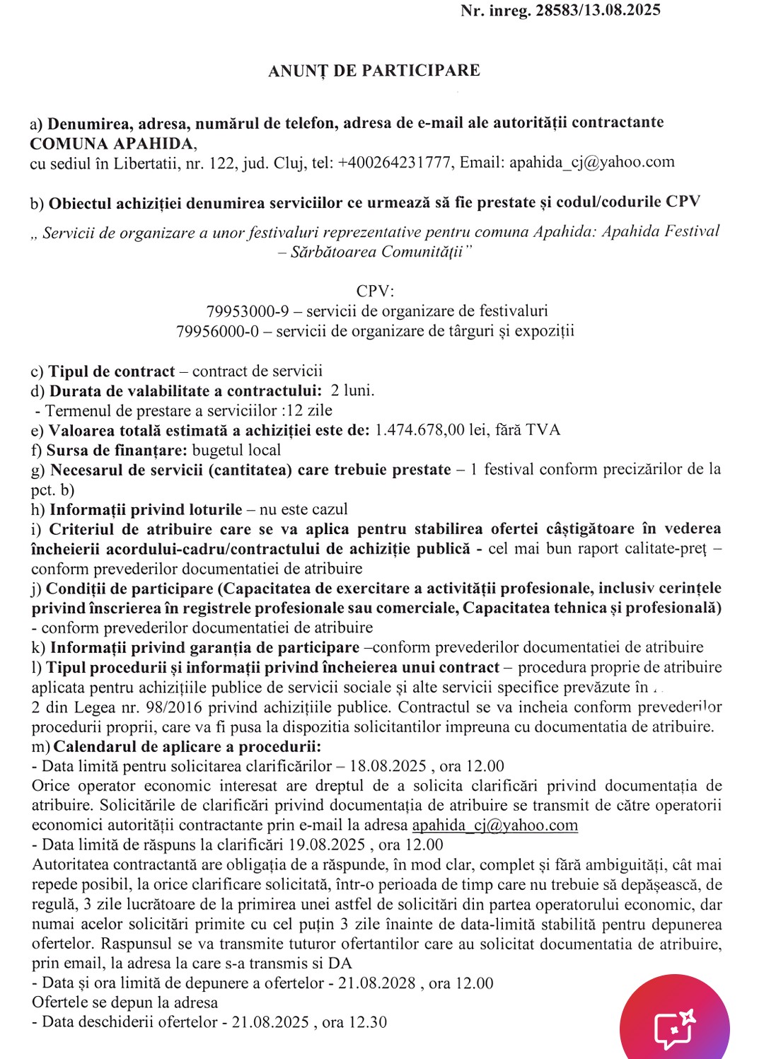 Administrația locală a publicat anunțul de participare pe data de 13 august 2025 pentru :servicii de organizare a unor festivaluri reprezentative pentru comuna Apahida: Apahida Festival – Sărbătoarea comunității”. Investiția pe care primăria vrea să o facă de la bugetul local al comunei este de 1.474.678 lei (fără TVA).