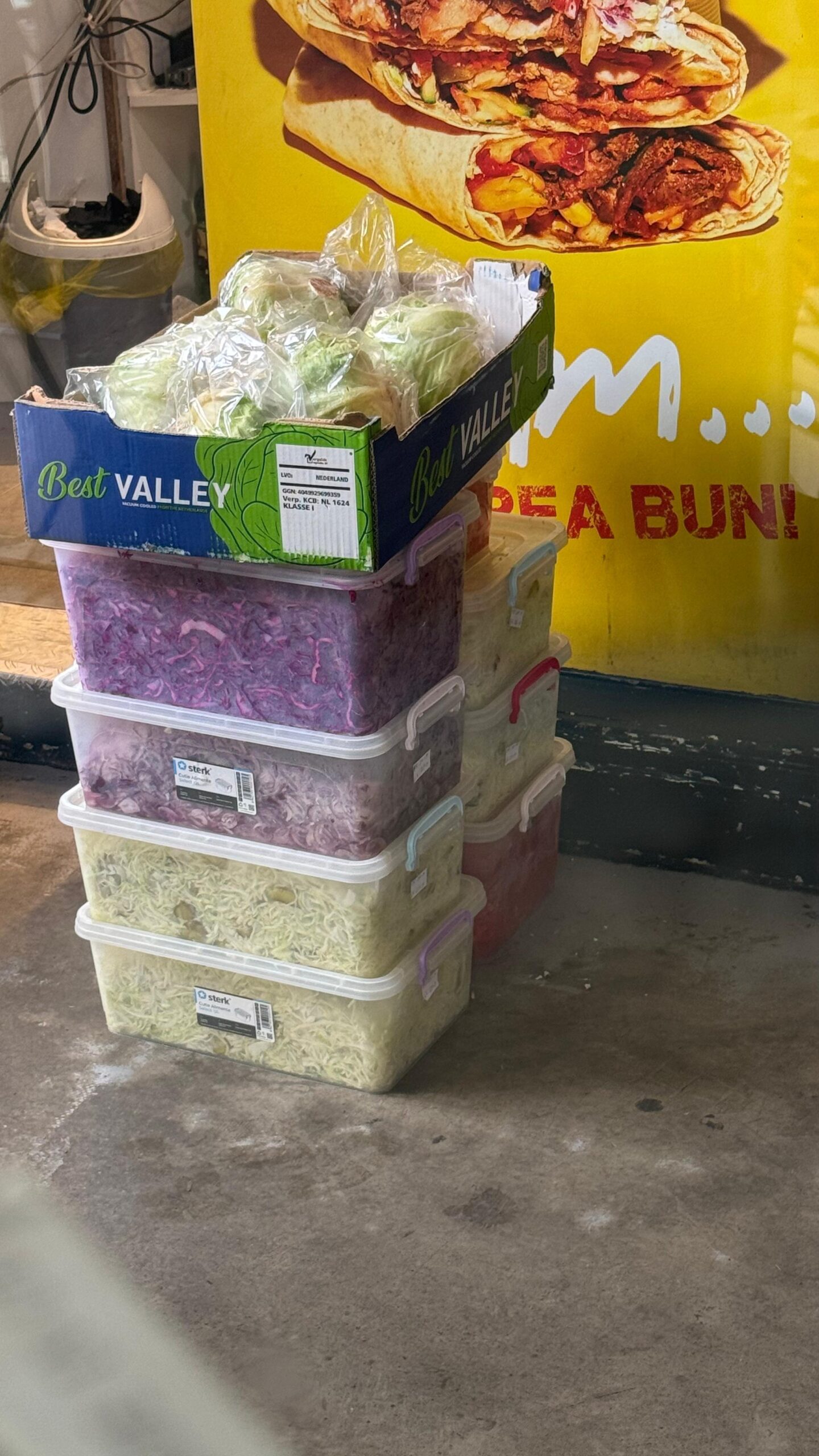 Angajații Rosa descarcă cutiile cu alimente direct din dubă și fără nicio remușcare le depozitează pe jos, fără să țină cont de minimele norme de igienă.