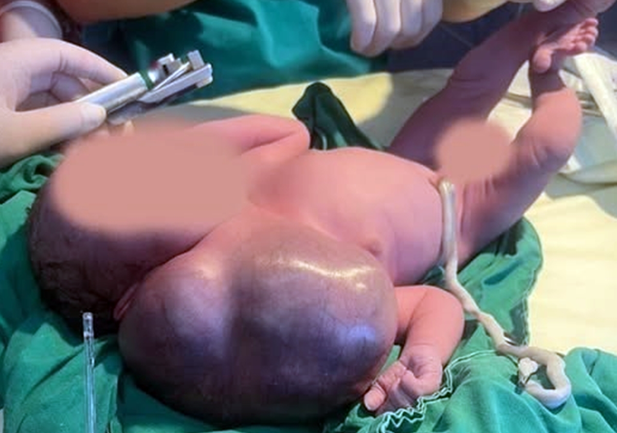 Copilul purta pe gât o tumoră de 800 de grame, adică mai mult de o cincime din greutatea sa.