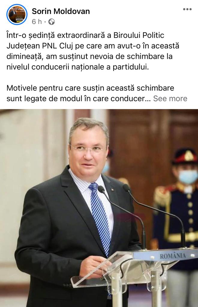„Motivele pentru care susțin această schimbare sunt legate de modul în care conducerea partidului se raportează la Guvernare și în special la criticile nefondate aduse unui Guvern din care facem parte. Ori, să te afli la guvernare și în același timp să ai un discurs tipic de opoziție este marcă înregistrată a altui partid politic (USR), nu a #PNL”, susține Moldovan pe facebook.