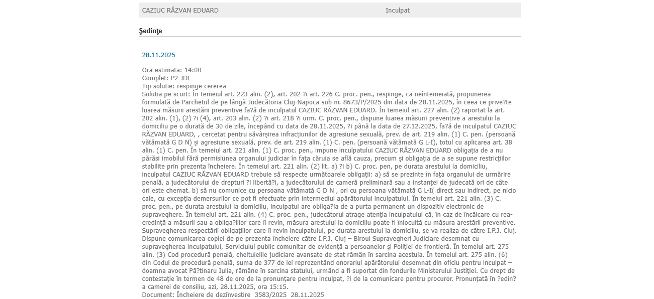 ”Dispune luarea măsurii preventive a arestului la domiciliu pe o durată de 30 de zile, începând cu data de 28.11.2025, și până la data de 27.12.2025, față de inculpatul Caziuc Răzvan Eduard, cercetat pentru săvârşirea infracţiunilor de agresiune sexuală, … (persoană vătămată G D N) şi agresiune sexuală, … (persoană vătămată G L-I)”, se arată în decizia Judecătoriei Cluj Napoca.