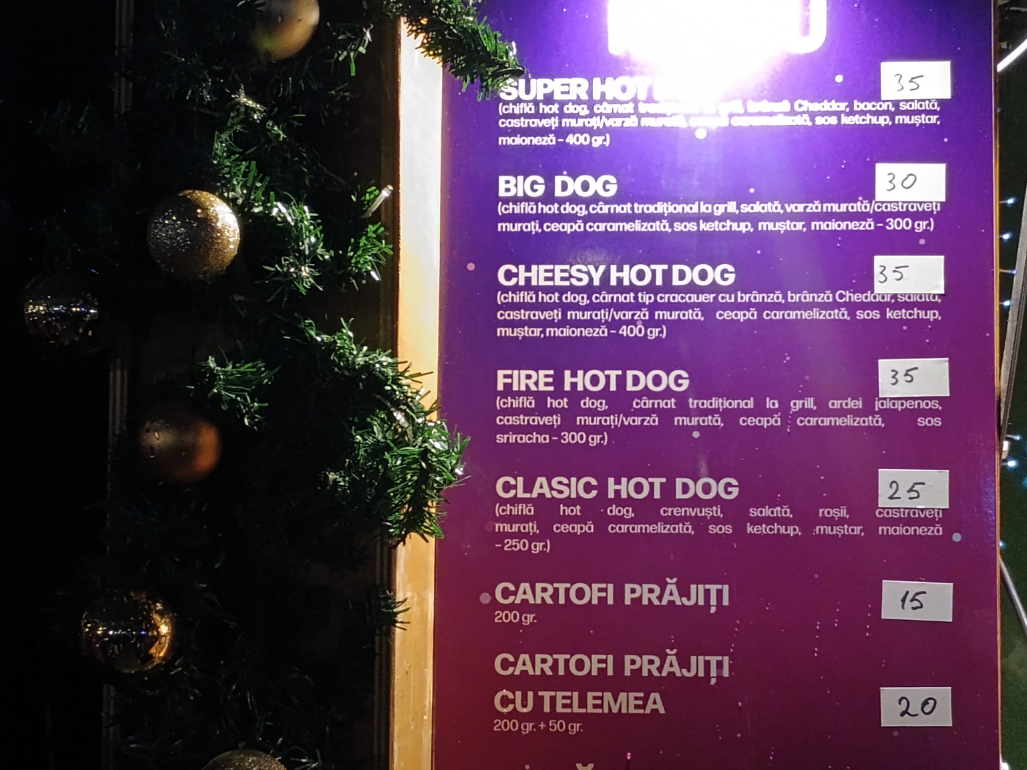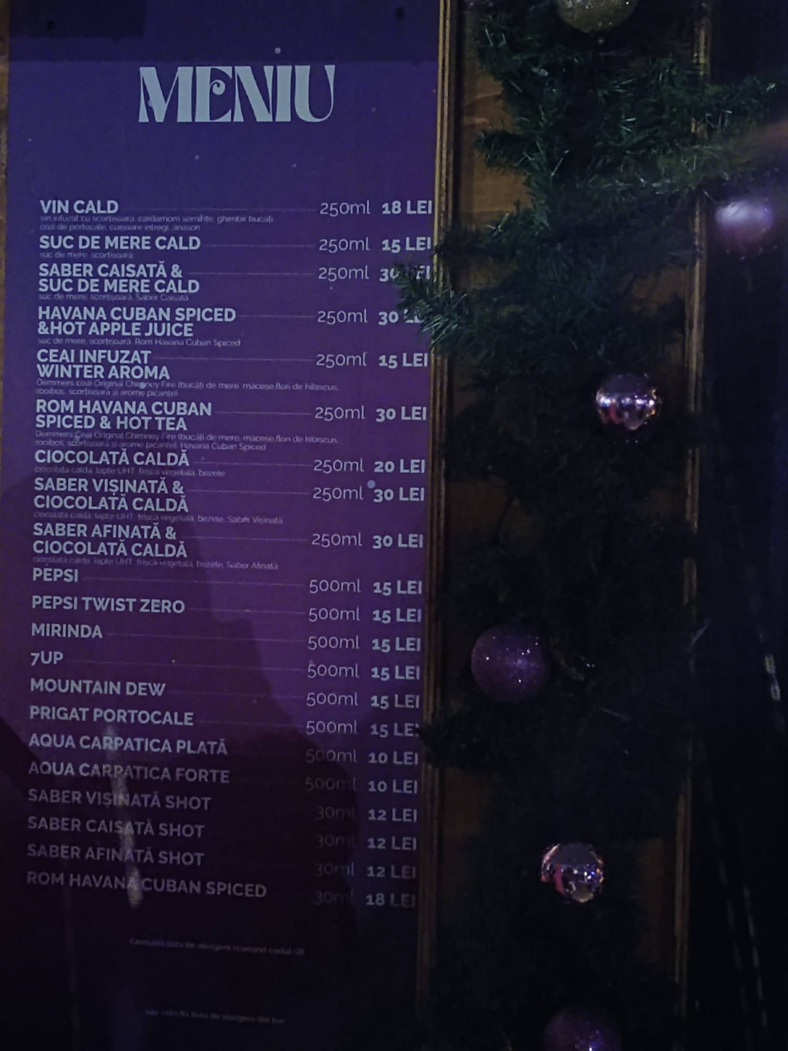 Un pahar cu vin cald, de 250 de ml costă 18 lei. Un suc de mere cald – 15 lei, un ceai infuzat – 15 lei și o ciocolată caldă – 20 de lei.