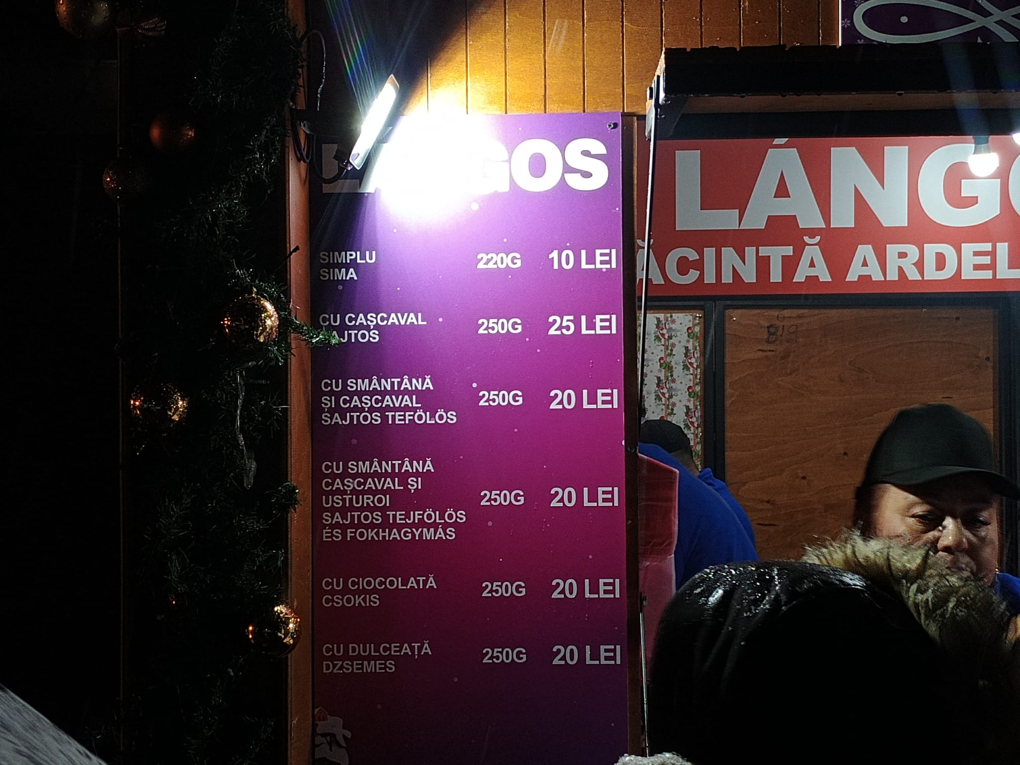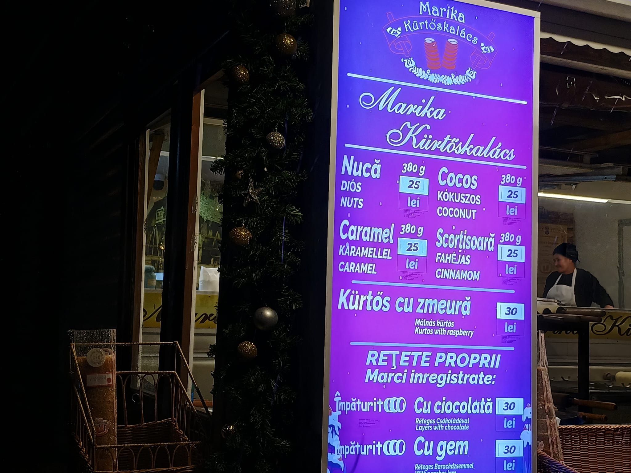 Un kurtoskalacs costă 25 de lei, o plăcintă ardelenească cu șuncă și cașcaval – 20 de lei.