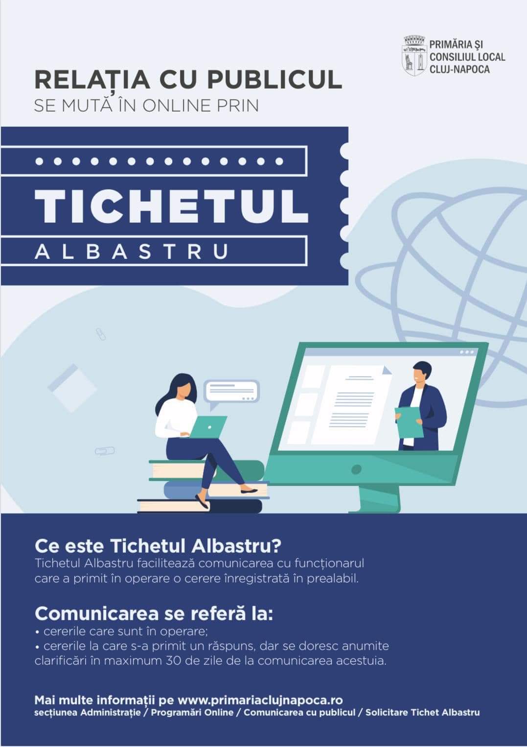 Tichetul Albastru este un serviciu de comunicare directă, la cerere, prin programare online între fiecare cetățean care are o solicitare înregistrată la Primăria Cluj-Napoca și inspectorul (personalul de execuție) care o are în operare în vederea furnizării unui răspuns și clarificarea unor aspecte privind serviciul administrativ solicitat.
